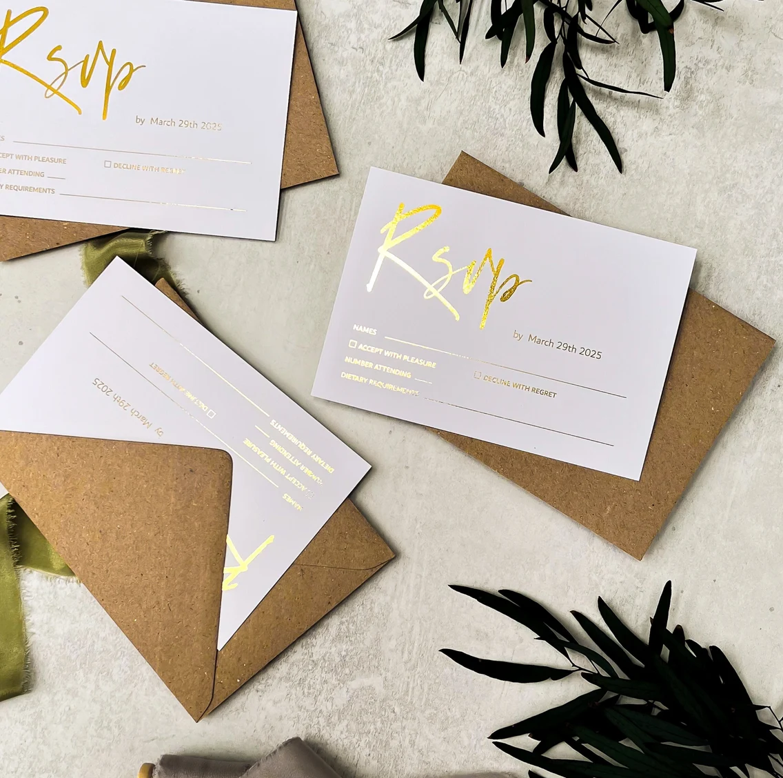 Choose from gold or silver foil, customize fonts, and select colors that align with your event theme. Personalize each RSVP card to reflect your event’s aesthetic while adding a touch of elegance.