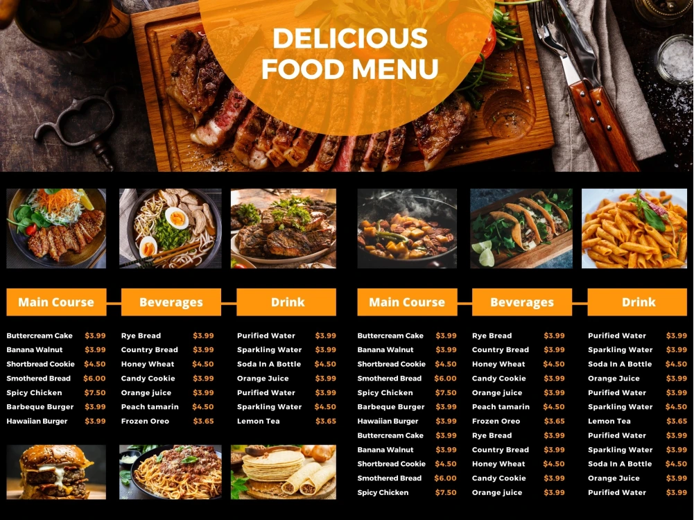 Incorporate bold typography and vibrant colors to catch customers’ eyes, or go for a minimalistic design to focus attention on your food offerings. Use high-quality images of signature dishes or seasonal items to make the menu more appealing. Consider separating sections for ease of reading, such as appetizers, main courses, and beverages.